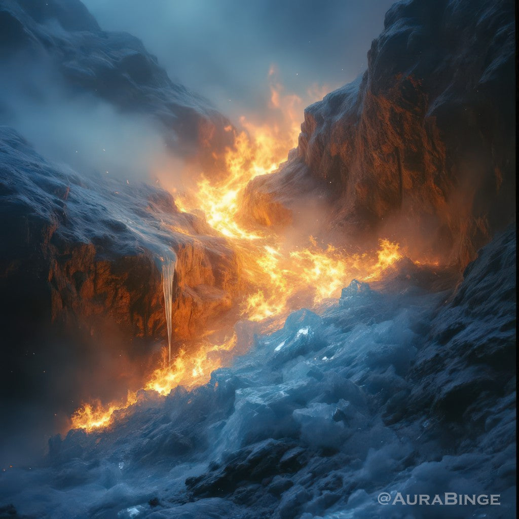Graphic’s Story Idea : Beneath a bruised twilight sky, fire meets frost in a defiant dance of extremes. Crimson lava surges through icebound cliffs, carving a path where creation and destruction entwine. This moment, forged in molten fury and frozen silence, speaks of resilience, transformation, and nature’s dramatic duality.